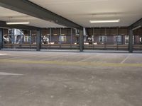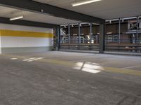 A mid-size car parked at a parking level of a parking garage in Berlin, Germany. The urban landscape of the European city is illuminated by the light of day and features architectural elements such as concrete, steel, glass, and tile. The infrastructure of the public space provides a reflection of the buildings, roads, and walkways.