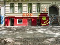 a restaurant in the middle of a narrow city street with graffiti on the wall and the sidewalk outside the building
