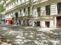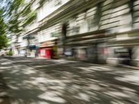 A snapshot of urban exploration in the art district of Berlin, Germany. From the cobblestone roads and mixed-use buildings to the graffiti and street art, this city is filled with a vibrant mix of architecture, infrastructure, and human settlements. The red bicycle and motion blur of a vehicle on the hard shadow surface create a vibrant atmosphere of life and motion in this European town.