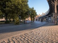 The morning light casts a shadow on the cobblestone street and asphalt road surface of Kreuzberg, Berlin, Germany. Urban exploration unveils the unique architecture and public spaces of this European city, set against a clear autumn sky with leaf-strewn flooring and visible contrails.