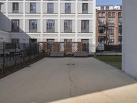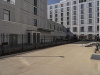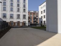 A view of modern architecture and urban design in Berlin, Germany, featuring a mixed-use residential area with a walkway, an open space, a condominium, a public space, a courtyard, and a hinterhof. The scene is illuminated by a clear sky and features a road surface, a window, and a room in a building or house. Real estate and material property in this vibrant city are on full display.