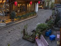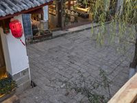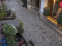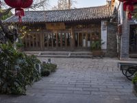 The cobble stone walkway leading up to a residential building at dawn in Lijiang, Yunnan, China. The clear sky and classic architecture of the old town make it a perfect tourist destination with its traditional Chinese restaurants, temples, and botanical gardens. With its scenic open spaces, traditional infrastructure and vibrant city life, visitors can explore its many alley-ways, courtyards, and public spaces.