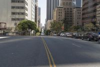A view of the downtown area of Los Angeles, California, USA, on a clear day. Automobiles, infrastructure, and residential areas line the straight asphalt road in this metropolitan metropolis.