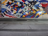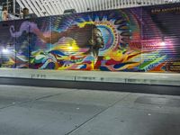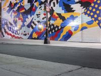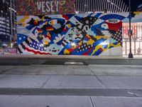 A nighttime view of a concrete street with a wall of graffiti art in Manhattan, USA. People are walking in the plaza while a street light illuminates a mural and a car passes by. The skyline of the metropolitan area is visible in the background.