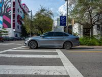 A person crosses the street in the bustling shopping district of Miami Beach, Florida. The distinctive urban design creates shadows and open spaces that provide a unique profile of the city during the day.