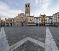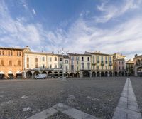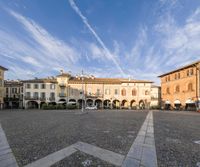 The azure sky stretches above the city's residential area, with its tree-lined roads and urban design. Building facades are visible, with window tints and shades, and the asphalt road surface extends through the public space.
