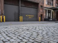 A view of the urban architecture of New York City, USA, featuring a yellow building with a classic facade, a cobblestone driveway, and a parking garage door on a sunny day.