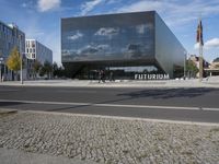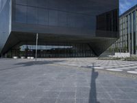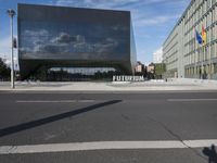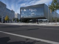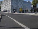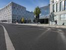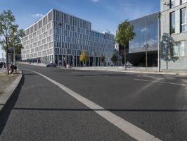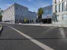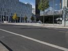 The modern architecture of a mixed-use residential area in Berlin, Germany is illuminated by a clear sky and sunshine, casting shadows and reflections onto the roads and glass-clad facades of office buildings, corporate headquarters, and stadiums. The sun also creates lens flares and contrails visible in the sky, while the urban infrastructure, including public space, transport, and parking lots, are visible in the foreground.