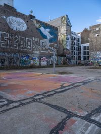 A basketball court in a courtyard of a Berlin city building surrounded by a graffiti wall, concrete surfaces, and a stadium in the background. Germany, Europe, urban design, and city life all come together in this open space.