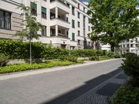 A peaceful and picturesque alley-way in Berlin, Germany, featuring cobble stone flooring, modern architecture, hard shadows, lush vegetation, and a clear sky. This residential area offers a glimpse of urban city life in Europe.