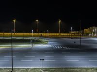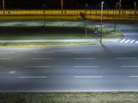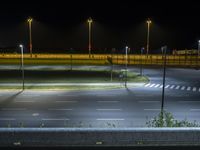 A midnight view of the modern architecture of a highway in Berlin, Germany, illuminated by artificial yellow light. Elevated lanes, guard rails, and an Armco barrier are visible, with a stadium in the background.