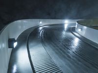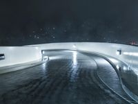 A view of the modern urban highway infrastructure near Los Angeles, California, USA. The scene includes a bridge, an Armco barrier, a parking garage, a parking lot, street lights and various other elements, all illuminated by a combination of natural and artificial light. The atmosphere is calm and freezing, with snow covering the ground in winter.