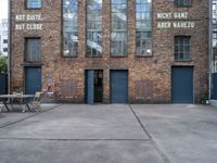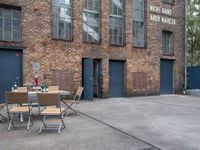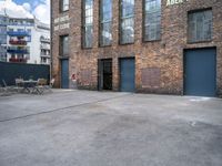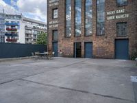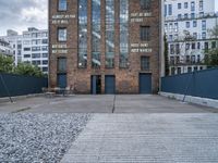 A classic brick wall in the courtyard of a warehouse in Berlin, Germany, Europe. The open space has an urban design with asphalt, concrete, dirt, and gravel on the ground surface. The clear sky provides a backdrop to the modern and classic architecture.