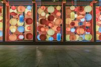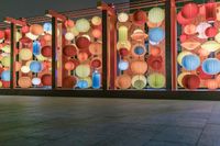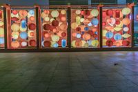 Celebrating the holiday season, the modern architecture of Guangzhou, China is illuminated by artificial light against a dark concrete paver surface.