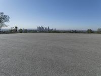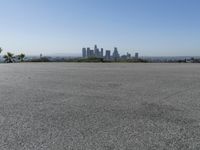 A view of an urban city skyline from a road surface, with a clear sky, sunshine, and a residential area in the background. The horizon is dotted with trees, grass, fields, and a sea in the distance, while the asphalt lane extends into the path ahead.