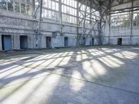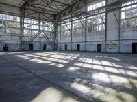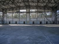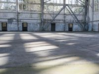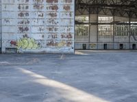A concrete and brick factory building with a metal hangar, an automobile with an alloy wheel, and a graffiti wall in the foreground all illuminated by the sunlight in Berlin, Germany.