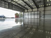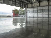 View of an expansive factory complex in Los Angeles, California, USA featuring a mix of modern glass windows, concrete structures, metal roofs, and loading docks. The open space is illuminated by a cloud-filled day sky, and the reflection of the surrounding cityscape can be seen on the surfaces of the buildings and structures.
