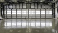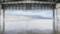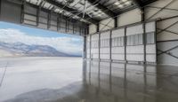 The modern architecture of a city skyline is reflected in the water below, with a mountain range in the distance. A concrete floor, glass windows, and open space provide a glimpse into the industrial interior of a hangar, warehouse, or factory.