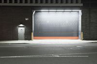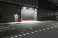 A profile of a parking garage and warehouse on an asphalt road at night in Manhattan, New York, USA. Artificial lights from a street light and a loading dock illuminate the urban industrial infrastructure of a metropolitan area.