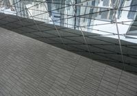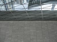 An elevated view of a business district of an urban cityscape reveals a unique structure of modern architecture, glass facades, and steel infrastructure. The open parking lot and the reflective surface of the office building's roof are illuminated by the sun on a clear day.