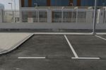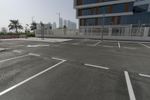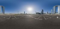 An aerial view of open public spaces, roads, and high-rises in the metropolitan area of Abu Dhabi, United Arab Emirates on a clear day. The lane lines, parking lots, and asphalt roads give the city its distinct infrastructure.