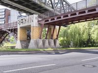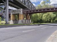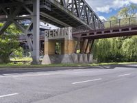A view of the city of Berlin, Germany showcasing its modern urban infrastructure including roads, bridges, and underpasses. The image captures a sunny day with trees and vegetation lining the streets, creating a beautiful urban landscape. The architectural design and composite materials used in the construction of the buildings and concrete bridges add to the charm of this metropolitan area in Europe.