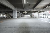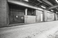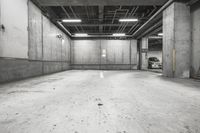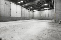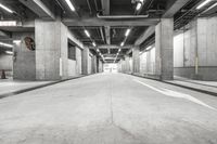 A monochrome photo of an urban landscape showing a concrete road lined with buildings, street lights, and parking lots.