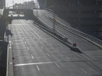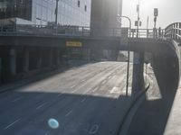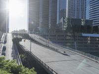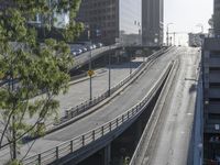 A highway entrance ramp curves down to the city below, surrounded by skyscrapers and vegetation. The bridge, handrail, and guard rail add to the urban atmosphere, while a clear sky reveals the low-rise buildings in the distance.