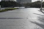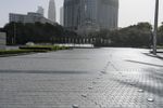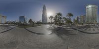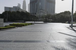 The sprawling metropolitan area of Dubai is filled with a variety of urban infrastructure, from roads and buildings to open spaces and walkways. This scene showcases a residential area with a mix of structures, trees and a clear sky overhead. The road surface is bustling with traffic and pedestrians, showcasing the hustle and bustle of the United Arab Emirates' largest city.