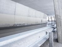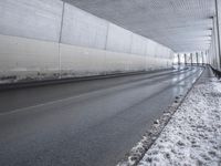 A composite of a highway underpass road in a metropolitan area of Germany, featuring grey winter sky, Armco barrier, steel guard rail, wet concrete, snow, and a tunnel. Located in the Alps, this fixed link provides a vital connection to Switzerland and other parts of Europe.
