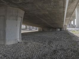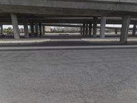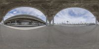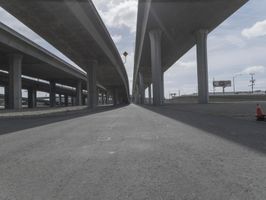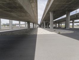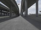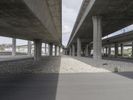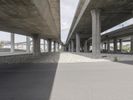 A public walkway winds around a fixed link bridge, connecting two sections of the Los Angeles urban infrastructure. The vehicle-free lane is lined with guard rails and steel structures, and the asphalt road surface stretches out into an open space, dotted with parking and profile automobiles, beneath a cloudy California sky.