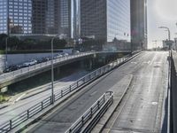 The sun shines down on a metropolitan area, with its asphalt roads and bridges providing a fixed link for public transportation and urban traffic. Skyscrapers line the horizon, and the clear sky reveals the sun's presence in the city.