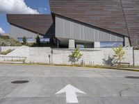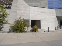 A view of the Brutalist architecture in Salt Lake City, Utah, USA. The blue bridge, glass walls, concrete flooring, and metal handrails stand out against the clear sky. In the background, the mountain range and suburban neighborhoods can be seen.