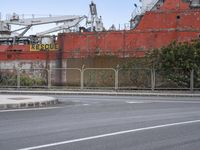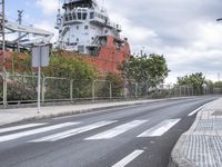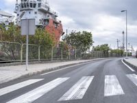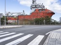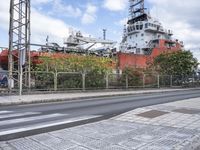 A residential area of Tenerife, Spain with a combination of urban infrastructure and vegetation. A vehicle is seen passing by a tree near an asphalt road, with a factory in the background. The infrastructure also includes a crosswalk, traffic sign, public space, and a highway entrance and exit. The day is partially cloudy with a bulk carrier and an anchor handling tug supply vessel in the harbor.