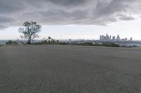 A view of a cityscape with a field filled with trees, a road, and a skyline of skyscrapers on the horizon, all bathed in sunshine.