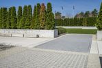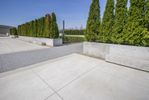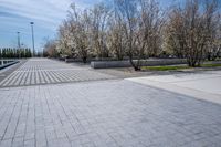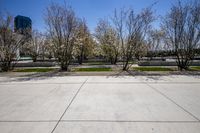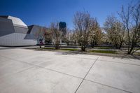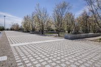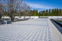 A view of an urban landscape with modern architecture and cityscape, surrounded by roads, grass, and houses on a sunny day. Tall trees and fluffy clouds add to the serene atmosphere. Walkways, road surfaces, and vegetation create a beautiful estate in the real estate area. Gravel and concrete surfaces provide a structured and urban feel. The park offers space for recreation, with contrails streaking across the clear sky. The landscape is dotted with residential areas and open spaces, featuring various structures, walls, and public spaces. The surface of the road is smooth asphalt, with lines marking lanes and paths. Curbs separate the road from the neighborhood, adorned with woody plants, even in winter. The urban design includes contrails, flooring, cobble stones, and water, creating a reflection of the surrounding environment.