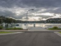 A gloomy grey sky hangs over the city as the first rays of sunlight break through, illuminating the urban landscape at dawn.
