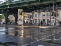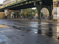 A view of the city of Berlin, Germany, showcasing its urban infrastructure and vibrant street life. The photo features a road with asphalt, a bridge, an underpass, and various buildings. The day is bright, with trees and vegetation adding a touch of greenery. Clouds float in the sky, while vehicles, including cars and bicycles, can be seen on the road. The image captures the essence of urban design and architecture in Europe's metropolitan areas.