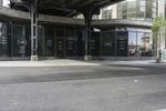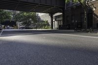 A view of a cityscape with tall buildings and lush trees lining the streets.