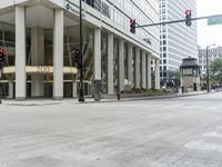 A view of a downtown business district in Chicago, Illinois. Featuring modern architecture, a mixed-use neighborhood with office buildings, concrete streets, vehicles, trees, and curbs. The metropolitan area is alive with activity during the day.