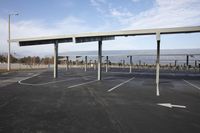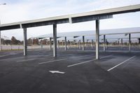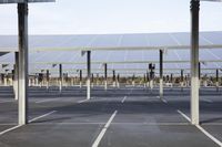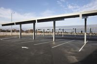 A view of a city in the USA, with tall buildings and a parking lot filled with vehicles. The asphalt road leads straight down the road, while trees provide shade and add to the urban landscape.