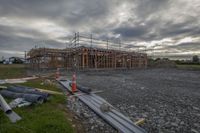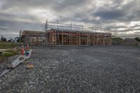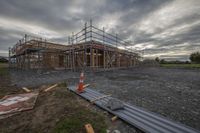 A gloomy grey sky hangs over the city as the first light of dawn breaks. The urban design features buildings, roads, and open spaces, all blending into a composite material landscape. The asphalt road surface leads to a land lot with construction in progress. Vegetation and trees add a touch of green amidst the urban setting.