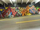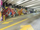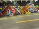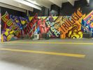 An architectural structure with a yellow facade stands in the middle of a bustling metropolitan area in Detroit, USA. The urban scene is composed of concrete, asphalt, and public space, with a parking lot, buildings, walls, and roads creating a unique infrastructure profile. Advertising is visible on the street, along with parking lanes, curbs, and flooring, completing the street scene.