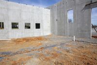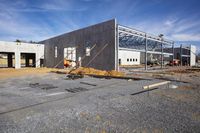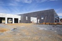 Aerial view of a cityscape with buildings, houses, and open spaces in Johnson City, Tennessee, USA. The architecture features concrete walls and asphalt surfaces. Construction sites and warehouses can be seen amidst the rugged landscape. The city's profile is outlined against the backdrop of clear blue skies, with contrails visible in the air.