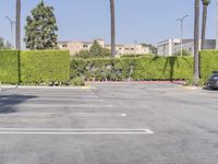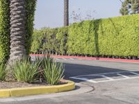 A view of a residential area in Los Angeles, California, USA. The cityscape features a road with asphalt surface, surrounded by green vegetation including trees, shrubs, and hedges. The clear sky adds to the picturesque scene of the suburban neighborhood. A parking lot and yellow architecture can be seen in the background.