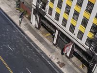 Aerial view of a modern architecture building in downtown Los Angeles, California, USA. The bustling city streets are lined with high-rise office buildings and urban infrastructure, with trees and vegetation adding a touch of nature to the scene.