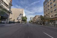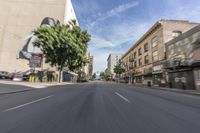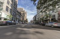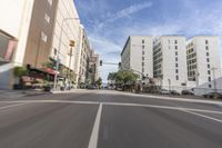 A view of the cityscape in downtown Los Angeles, California, USA. The photo shows a straight road with asphalt, surrounded by buildings and residential areas. The motion blur of passing cars adds a sense of movement and vitality to the urban scene.