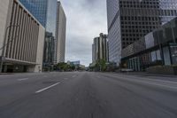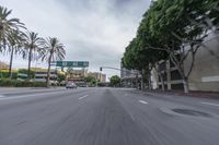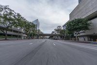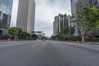 A view of the cityscape in downtown Los Angeles, California, USA. The high-rise buildings and urban design create a bustling metropolis, connected by a network of highways and bridges. The straight road, lined with trees, stretches into the distance, with motion blur from passing vehicles. The city's infrastructure and architecture reflect the vibrant city life of this metropolitan area.
