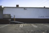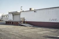 A view of the urban landscape in Los Angeles, California, USA. The image showcases the architecture of the city, with concrete and asphalt roads, parking lots, and industrial buildings. The clear sky and sunshine highlight the profile of the city's warehouses and residential areas. The photo also captures the infrastructure and transport, including vehicles and boats, in the art district of Los Angeles.
