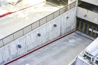 A high view of a concrete street in Los Angeles, California, USA. The urban landscape features buildings, houses, and a stadium, with an open space and parking deck in the foreground.
